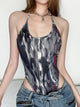 It is specifically designed for women. The fit type is skinny, hugging the body for a sleek and sexy silhouette. The fabric type is knitted, offering slight stretch for a better fit. The bodysuit is decorated with hollow out details, adding a unique and stylish element. The color style is camouflage, giving it a bold and eye-catching look. It features a spaghetti strap collar style, adding a feminine and delicate touch. The bottom of the bodysuit is open crotch, providing convenience and comfort.