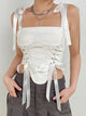 The dress is made to fit with a regular fit, is woven for comfort and structure, and is decorated with a lace-up design for added pop.