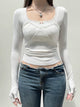 The top has full-length sleeves and a regular sleeve style, providing coverage and warmth. It features a V-neck collar, which adds a hint of sophistication and flatters the neckline. The top has a slim fit, accentuating the curves of the body and creating a flattering silhouette.