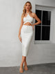 Vintage-inspired bandage dress features a flattering natural waistline and a chic halter neckline with delicate spaghetti straps that will make you feel like a fashion icon. Made from a blend of synthetic fiber, mesh, polyester, and spandex, this dress is both comfortable and stylish. The sleeveless design and ankle-length silhouette make it perfect for summer, but it can be worn all year round.