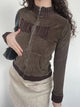 The fabric used is knitted, which adds to the comfort and softness of the garment. It is made of a blend of polyester and spandex, offering durability and a slight stretch for a better fit. The top showcases a patchwork pattern, creating a unique and eye-catching look. The sleeves are long, providing coverage and warmth. The collar is a square collar, adding a stylish and contemporary touch to the top.