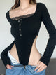 The solid pattern and soft material of polyester and spandex make this bodysuit a twinkle to the eye thanks to the shine of the signature antique-style button detail.
